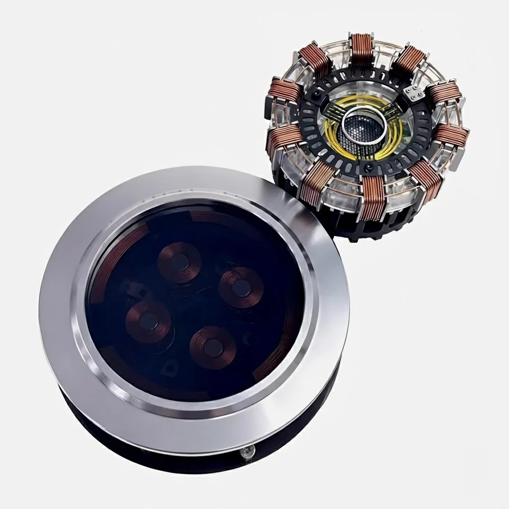 The transparent base houses electromagnetic coils that generate a controlled magnetic field. Once positioned, the reactor core locks into balance and begins floating. Power transfers wirelessly to illuminate the LEDs, creating a floating, rotating arc reactor effect that feels both futuristic and educational.